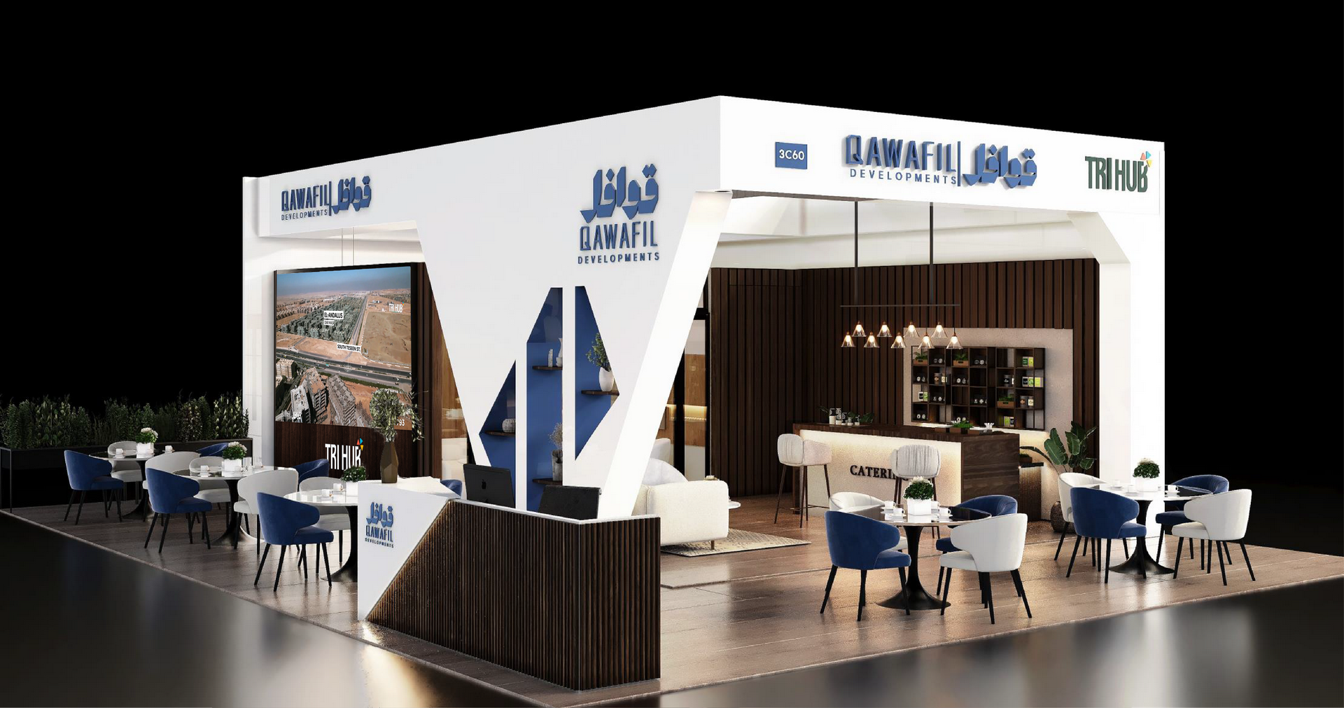 A Statement Structure: We conceptualized a multi-story, open-concept design that leveraged vertical space, ensuring Qawafil’s presence was visible from every vantage point in the hall. The final 3D design stood as a premium, architectural representation of their brand.Immersive Project Showcase: The design was meticulously planned to guide potential investors through dedicated zones for projects like Tri-Hub. This allowed for effective, in-depth presentations that captured the project’s mixed-use complexity (commercial, administ